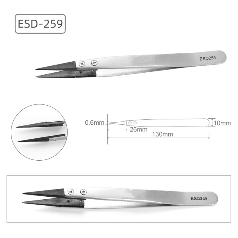 Головка з пінцетів виготовляється із суміші вуглецевого волокна та спеціального пластику, що може ефективно запобігти статичному накопиченню електроенергії та забезпечити безпечне робоче середовище для статичних чутливих компонентів.