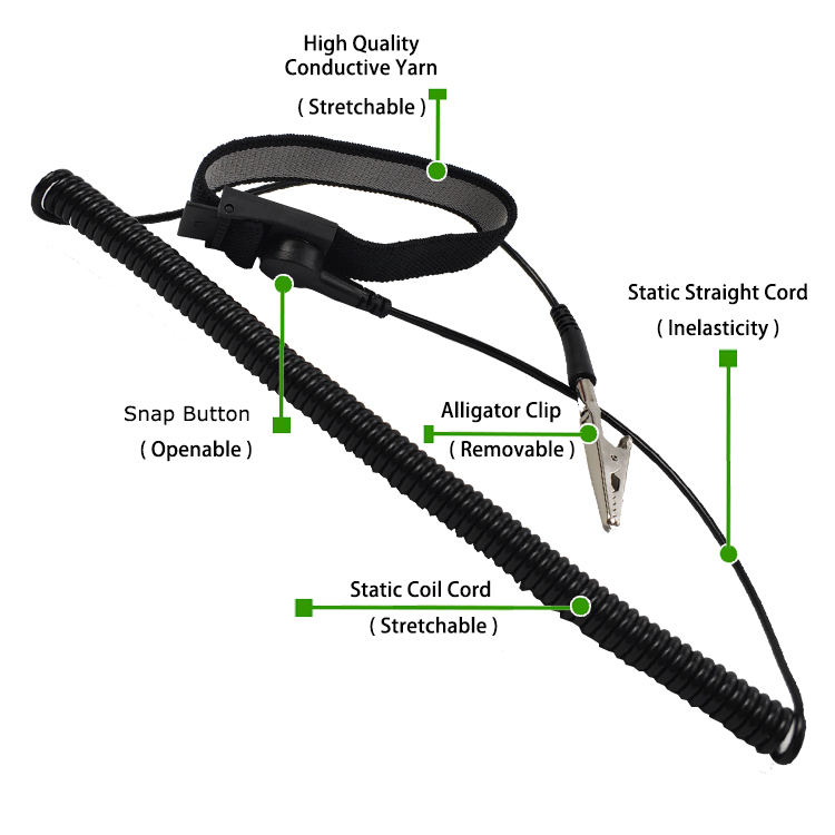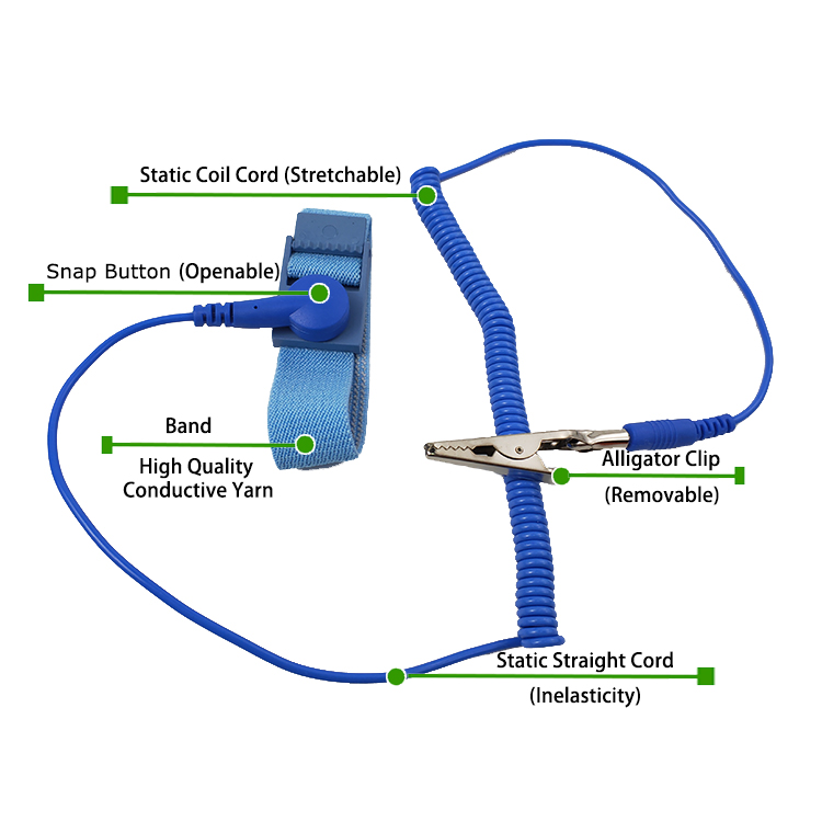 Провідний Антистатичний ремінь зап'ястя Ефективно експортує статичну електроенергію людини на землю через зап'ястальний ремінь та заземлюючий дріт, щоб запобігти статичній електроенергії у пошкодженні чутливих електронних компонентів. Цей процес забезпечує безпеку та надійність за допомогою стабільного опору.