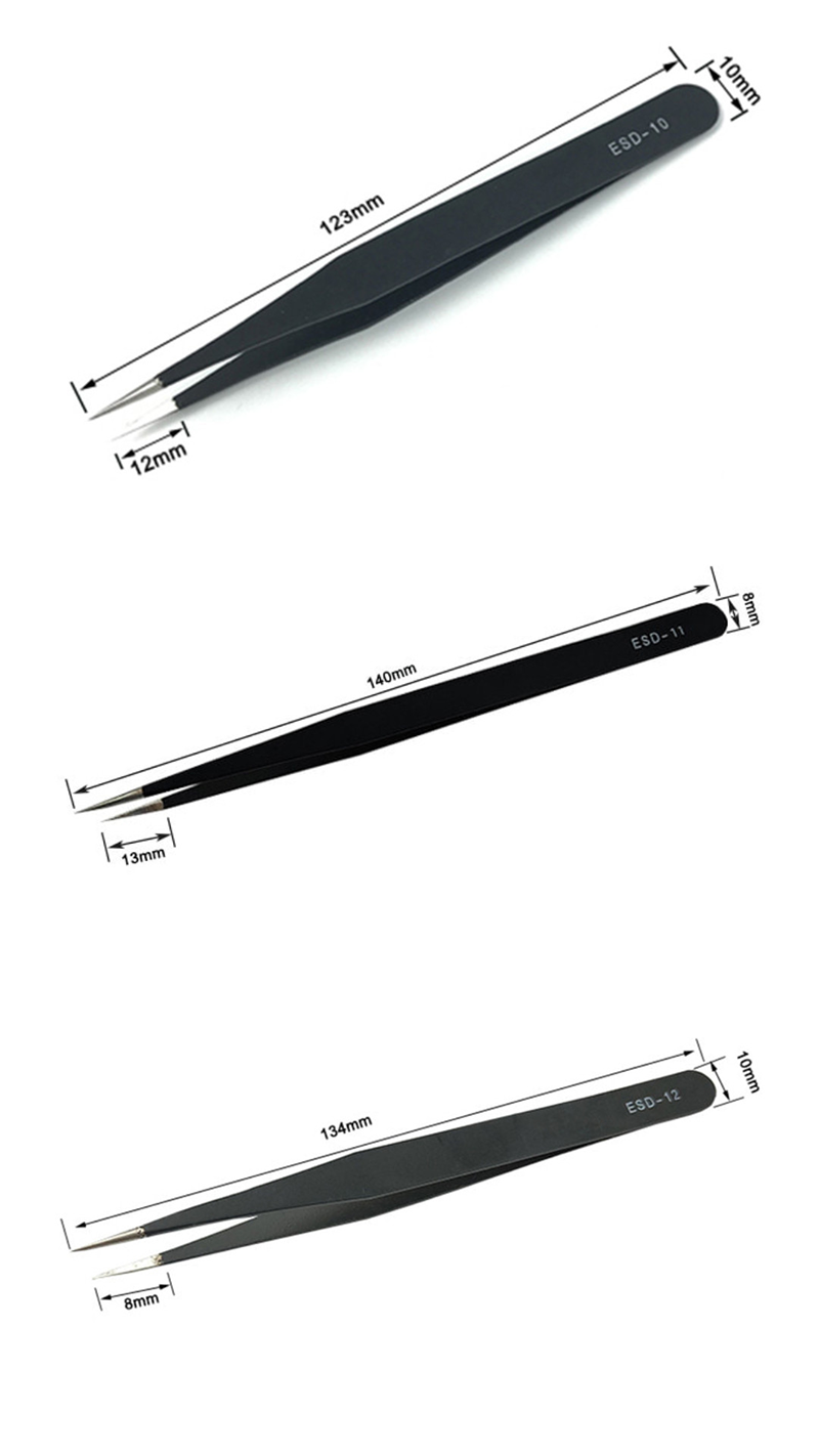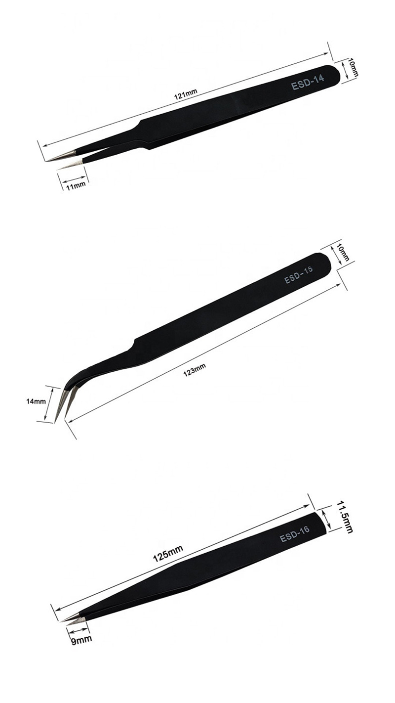 Сьогодні ми особливо рекомендуємо серію антистатичних пінцетів, які виготовлені з високоякісної нержавіючої сталі та мають резистентність до кислоти, немагнітну, хімічну корозійну стійкість, теплову стійкість та інші характеристики. Вони ідеально підходять для точних операцій у галузі електроніки: